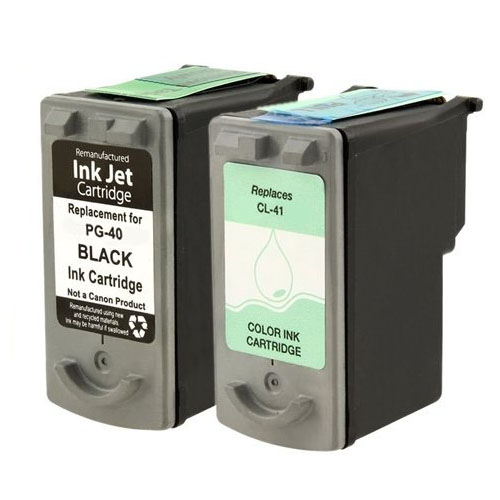2 remanufactured (PG-40 and CL-41) cartridges. The PG-40 Black ink cartridge and the CL-41 Color ink cartridge have been thoroughly cleaned, and inspected for any possible leakage, tested on the electrical circuitry, and ran through an actual print test. They contains the same amount of ink as the original Canon cartridges. (Brand names and trade marks are the property of their respective holders and are for descriptive use only. This product is NOT made by Canon.) 100% Satisfaction Guaranteed!